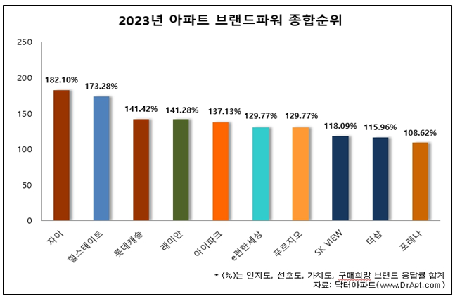 2023년 아파트 브랜드파워 조사결과 GS건설의 자이가 2년 연속 종합 순위 1위를 차지했다.