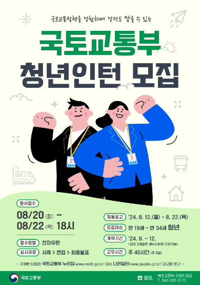 [한국건설경제뉴스=이보미 기자] 국토교통부는 청년들에게 공공부문에 대한 업무 경험을 제공하고 정책 수립 과정에 청년의 참여를 활성화 하기 위해 오는 22일까지 하반기 청년인턴을 모집한다고 14일 밝혔다.