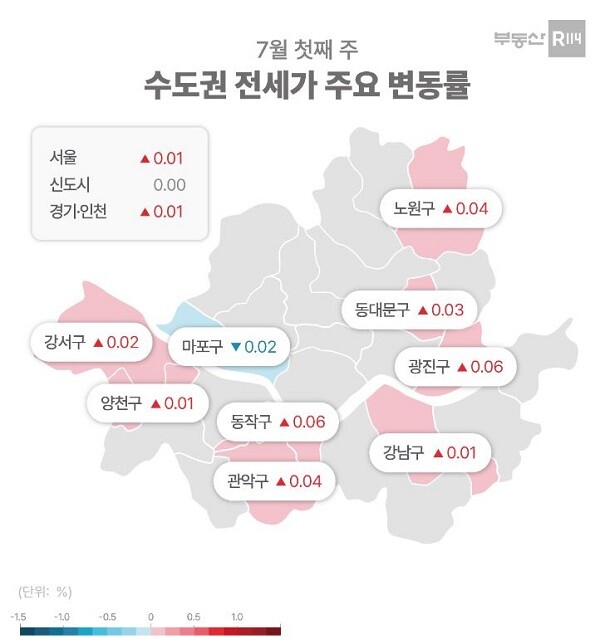 개별지역으로는 △동작(0.06%) △광진(0.06%) △노원(0.04%) △관악(0.04%) △동대문(0.03%) △강서(0.02%) △양천(0.01%) △강남(0.01%) 등이 올랐고 마포는 유일하게 0.02% 내렸다.