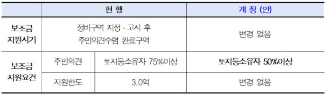 그동안 서울시는 '도시 및 주거환경정비법(도시정비법)'에 명시된 조합 설립 법정 동의율(토지등소유자 75% 이상)을 충족해야만 보조금을 지원해왔다. 하지만 이 높은 문턱 때문에 조합 직접 설립 추진에 어려움을 겪는 곳이 많았다. 서울시는 이를 완화해 주민 동의율 50%만 넘어도 보조금을 지원하기로 했다.