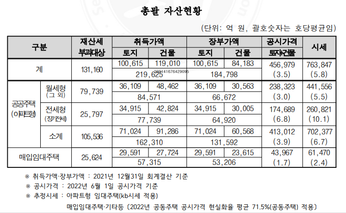 이번에 공게된 자산내역의 취득가액과 장부가액은 2021년도 12월 말 기준 회계결산 금액이며, 공시가격은 2022년도 6월 1일 기준이다. 추정 시세의 경우 아파트형 임대주택·장기전세주택은 KB 시세이고, 매입 임대주택은 2022년 국토교통부가 발표한 공동주택 공시가격 현실화율 71.5%를 기준으로 역산해 산정됐다.