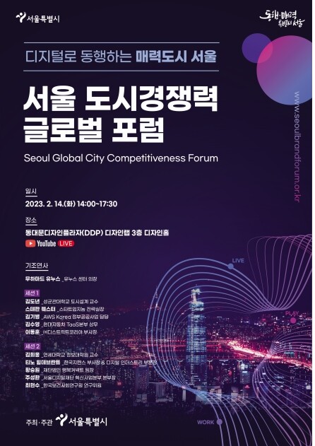 서울시는 오는 14일 오후 2시부터 5시30분까지 동대문 디지털프라자(DDP)에서 '디지털로 동행하는 매력도시 서울'를 주제로 한 '서울 도시경쟁력 글로벌 포럼'을 연다고 7일 밝혔다.