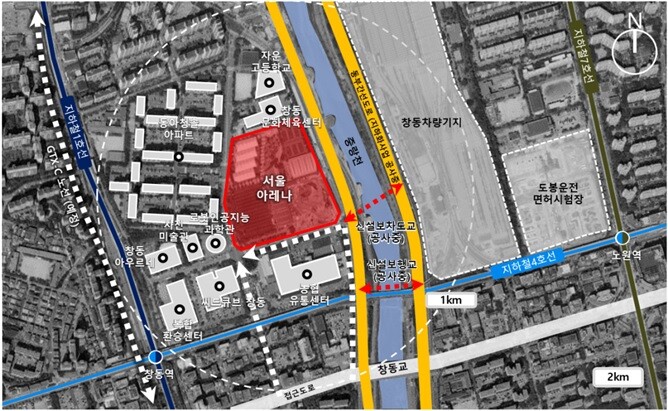 서울아레나는 지하철 1‧4호선이 지나는 창동역, 4‧7호선이 지나는 노원역과 인접한 곳에 조성된다. 창동역에 들어서는 GTX-C 노선 도입과 현재 공사 중인 동부간선도로도 지하화까지 마무리되면 서울아레나의 교통 편의는 더욱 확대될 것으로 기대된다.
