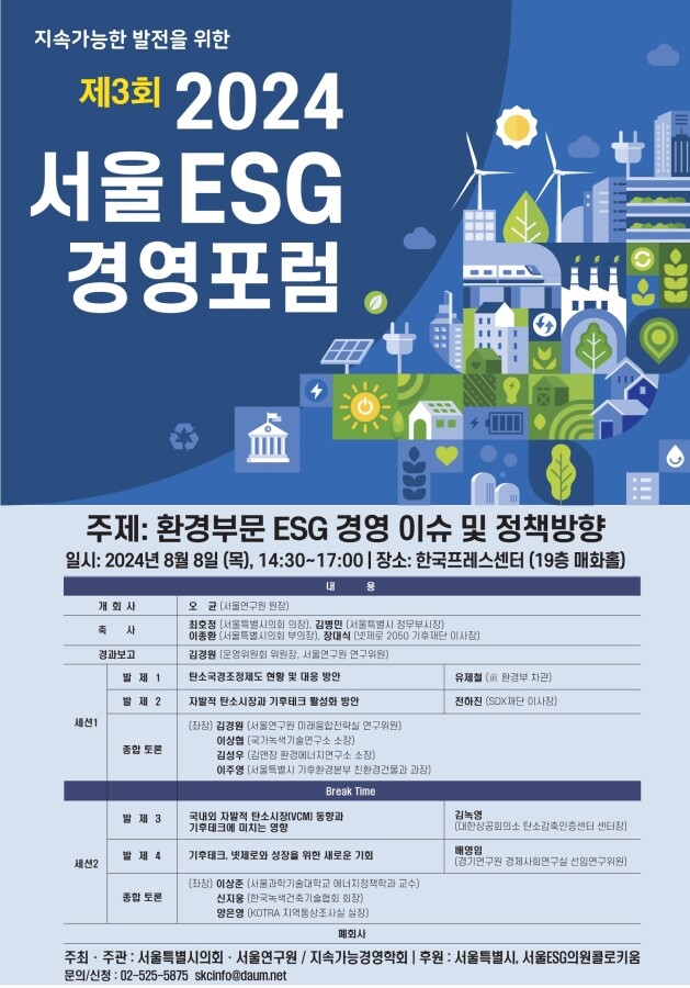 [한국건설경제뉴스=이보미 기자] 서울연구원은 오는 8일 오후 2시30분부터 한국프레스센터 19층 매화홀에서 '제3회 서울 ESG 경영포럼'을 연다고 7일 밝혔다.