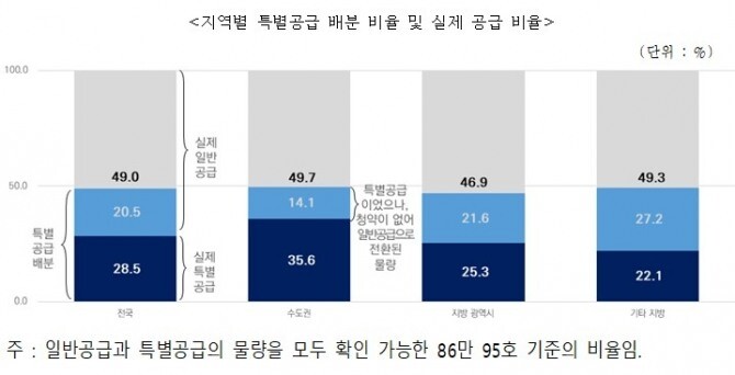 전체 분양 물량 중 49.0%가 특별공급으로 최초 배정되었으나, 청약자가 없어 일반공급으로 전환된 물량이 많아 실제로 수요자에게 공급된 특별공급은 28.5%에 불과했다.