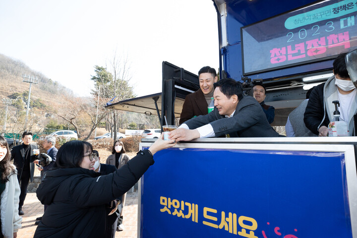 | ▲원희룡 국토교통부 장관이 6일 오전 단국대학교 죽전캠퍼스를 방문해 커피 트럭에서 '청년정책공모전'을 홍보하는 모습. 사진=국토부 제공 |
