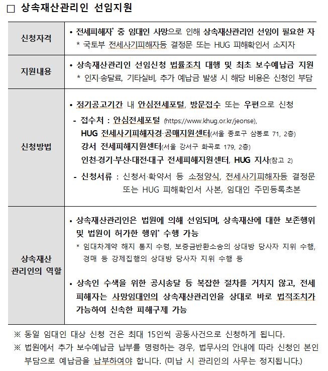 상속재산관리인 선임지원 사업은 동일한 사망 임대인에 대하여 전세피해자가 여러 명일 경우에 발생하는 관리인 보수 등 신청인 부담 비용을 줄이기 위해 정기공고 방식으로 진행하고 있다.