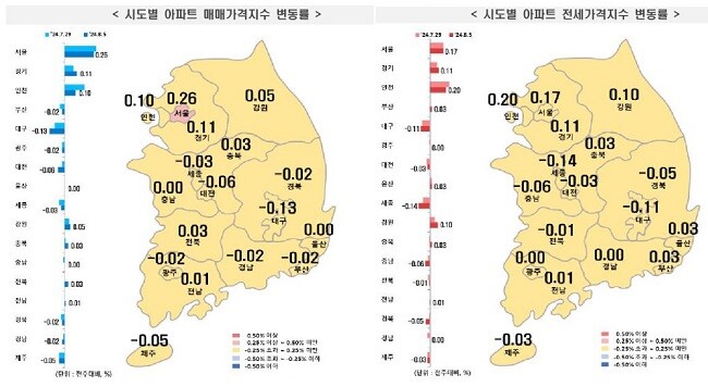 | ▲8월 1주 시도별 아파트 매매가격지수 변동률(왼쪽)과 전세가격지수 변동률 / 도표=한국부동산원 제공 |