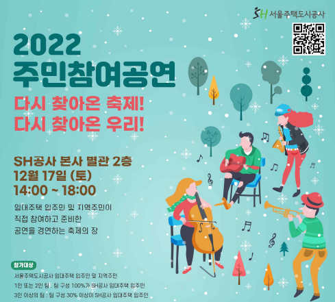서울주택도시공사(SH)가 임대주택 입주민과 지역주민의 화합을 위해 '2022 주민참여공연'을 열고, 오는 30일까지 작품접수를 받는다고 29일 밝혔다.