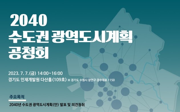 서울시는 인천광역시·경기도와 오는 7일 오후 2시 경기도 인재개발원 다산홀에서 '2040 수도권 광역도시계획'에 대한 공청회를 공동으로 연다고 6일 밝혔다.