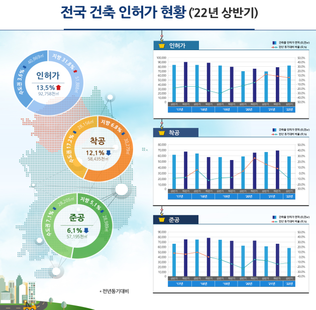 국토부는 26일 이런 내용을 담은 '2022년 상반기 전국 건축 인허가 현황'을 발표했다. 경기 동행지표인 착공과 경기 후행지표인 준공이 최근 건축 자재 가격 상승에 위축됐지만, 경기 선행 지표인 건축 인허가 면적이 올해 상반기 크게 늘어 앞으로 건축 부문 투자 활성화가 기대된다는 게 국토교통부 측의 설명이다.