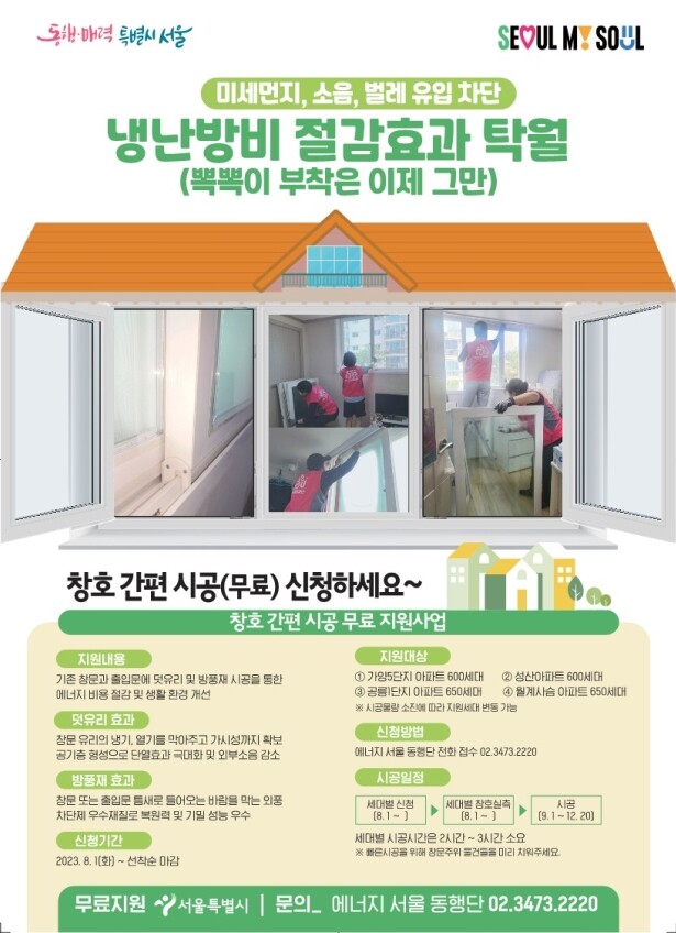 고효율 창호 간편시공은 서울시가 전액 지원하는 사업이다. 올해는 15억원의 예산을 투입해 SH 영구임대아파트 4개(강서 가양5, 마포 성산, 노원 공릉1.월계사슴1) 단지 총 2500세대를 대상으로 덧유리, 방풍재 설치 비용 100% 지원할 방침이다.