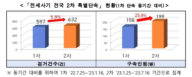 특히 2차 단속에서는 전세사기 조직에 대한 전국적이고 대대적인 수사가 이뤄졌으며 1차 단속 대비 검거건수가 597건에서 632건으로 5.9% 늘었고, 구속인원도 158명에서 199명으로 25.9% 많이 검거한 한편 몰수·추진보전 금액(법원 인용 기준) 역시 5억5000만원에서 172억7000만원으로 3040% 늘리는 성과를 냈다.