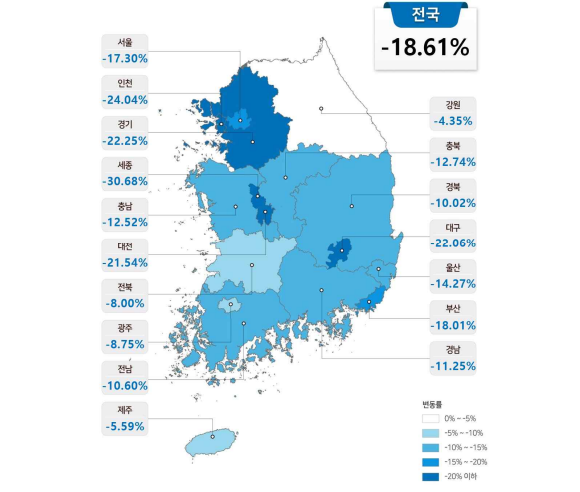 서울 17%·경기 22%·세종 17% 등 전 지역 하락