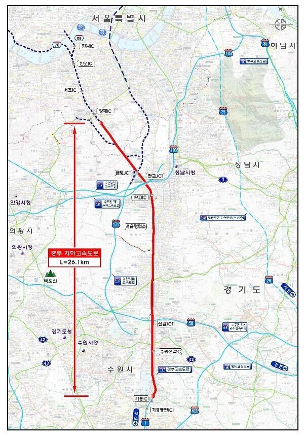 경부 지하고속도로 사업은 용인 기흥IC에서 양재IC 구간 26㎞에 4∼6차로의 지하고속도로를 짓는 것으로, 예산 3조8000억원이 투입된다.