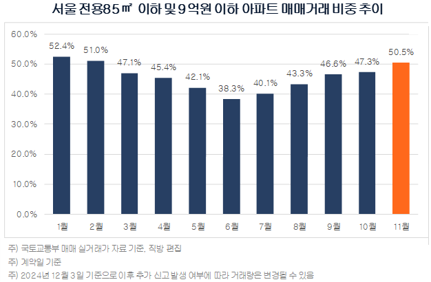 9일 직방이 국토교통부 실거래가 자료를 분석한 결과 11월 서울 전용 85㎡이하, 9억원 이하의 아파트 매매거래 비중은 50.5%로 지난 2월(51.0%) 이후 9개월 만에 절반을 넘어선 것으로 조사됐다.11월 서울 아파트 매매 거래량(2024.12.3기준)은 총 1,819건으로 이중 918건이 전용 85㎡이하 및 9억원 이하 거래로 집계됐다.