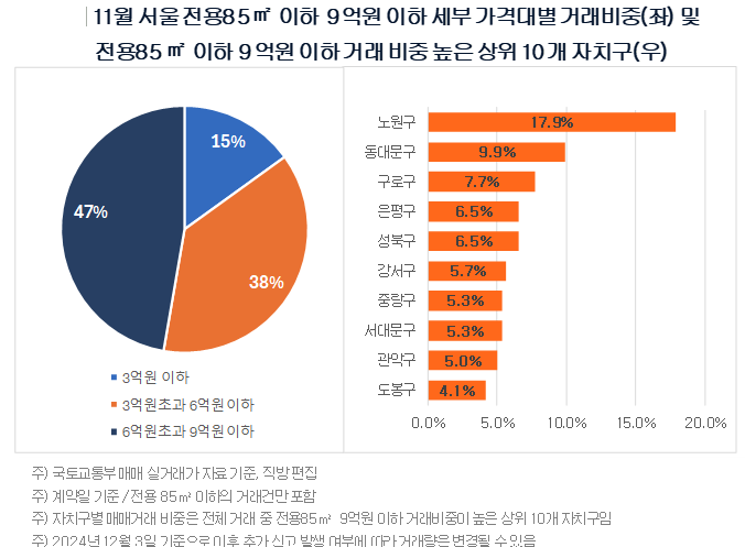 11월, 서울 아파트 매매거래 중 전용면적 85㎡이하의 9억원이하 아파트 거래 비중이 높은 자치구는 ▲노원구 17.9% ▲동대문구 9.9% ▲구로구 7.7% ▲은평구 6.5% ▲성북구 6.5% 순이다.