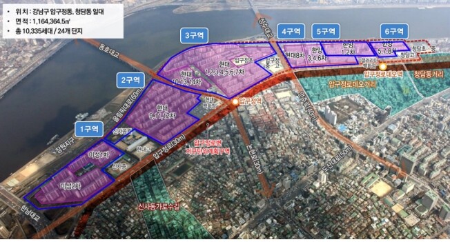 서울 강남구 압구정동에서는 현재 미성·현대·한양 등 아파트 1만여 가구가 6개 구역으로 나뉘어 통합 재건축을 추진하고 있으며, 이 가운데 2~5구역이 이번에 신속통합기획에 참여하게 됐다.
