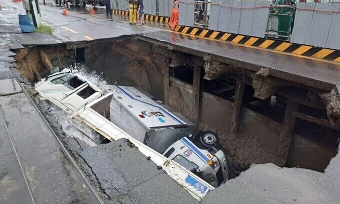 | ▲지난달 21일 오전 부산 사상구 새벽로 인근 도로에서 가로 10m·세로 5m, 깊이 8m 규모의 땅꺼짐이 발생해 차량 두 대가 빠져있는 모습. 사진=부산소방재난본부 제공 |