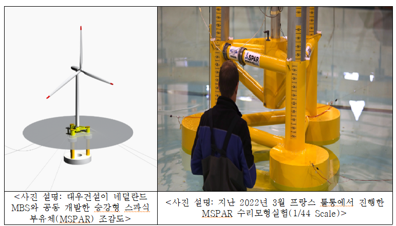 대우-MBW 개발 승강형 스파식 부유체는 조립/이동은 반잠수식, 운영은 SPAR 형태로 전기 생산