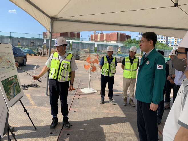 | ▲강희업 국토교통부 대도시권광역교통위원회 위원장(오른쪽)이 8일 오후 2시 인천 검단 한국토지주택공사(LH) 검단사업단을 찾아 인천 검단지구 광역교통 개선책·보완책 수립 추진 상황을 점검하는 모습. 사진=국토부 제공 |