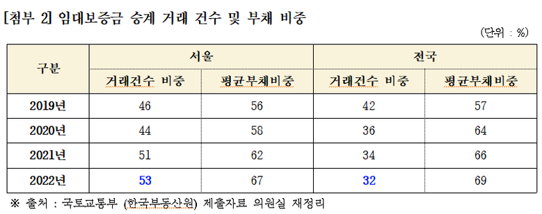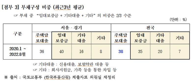 2020년부터 올해 8월까지 전체 주택거래에서 부채가 차지하는 비율은 48%인 것으로 확인됐다. 이중 주택담보대출이 38%로 약 3분의 1을 차지하며, 나머지는 임대보증금 및 신용대출, 약관 대출 등이다. 금융당국의 규제에서 벗어나는 임대보증금 등의 비중이 더 높은 것을 확인할 수 있다.
