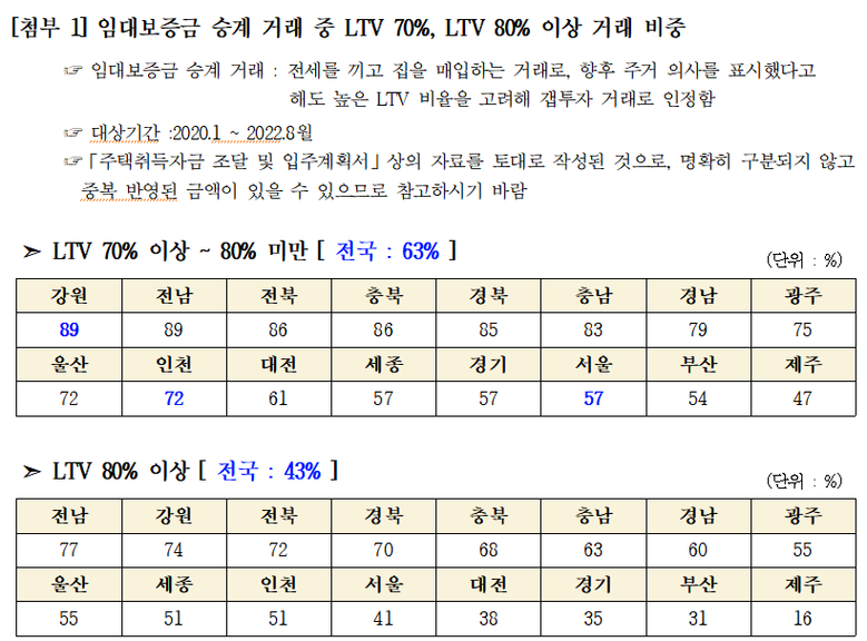 국회 기획재정위원회 소속 더불어민주당 홍성국 의원(세종특별자치시갑)이 한국부동산원으로부터 제출받은 자료에 따르면, 최근 3년간 갭투자가 서울시는 50%, 전국적으로는 30%가 넘었고, 이중 LTV 70% 이상인 거래는 전국적으로 63%에 이르며, 80% 이상인 거래도 43%에 달하는 것으로 확인됐다.