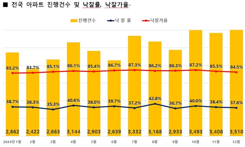 경·공매 데이터 전문기업 지지옥션이 9일 발표한 '2024년 12월 경매동향보고서'에 따르면 지난달 전국 아파트 경매 진행건수는 3510건으로 전달(3408건) 대비 3% 증가했다.