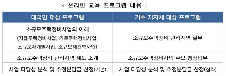 대국민 대상은 주민이해도 제고를 위한 기초적인 제도 안내, 지자체 담당자 대상은 실무 중심의 심화 내용으로 교육 프로그램을 지원한다.