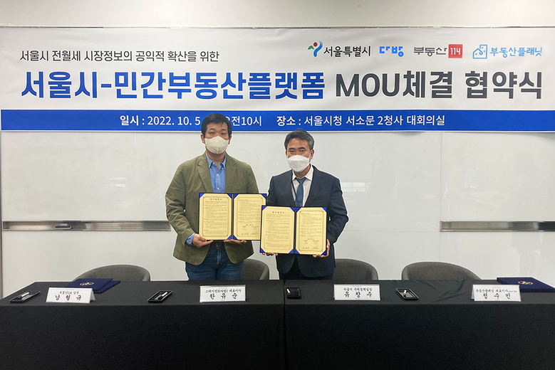 이번 협약은 다방과 서울시가 전·월세 시장정보의 공익적 확산을 위한 상호 협력을 바탕으로 서울시 전·월세 시장의 안정을 도모하고 정보 비대칭성을 완화하기 위해 마련됐다.