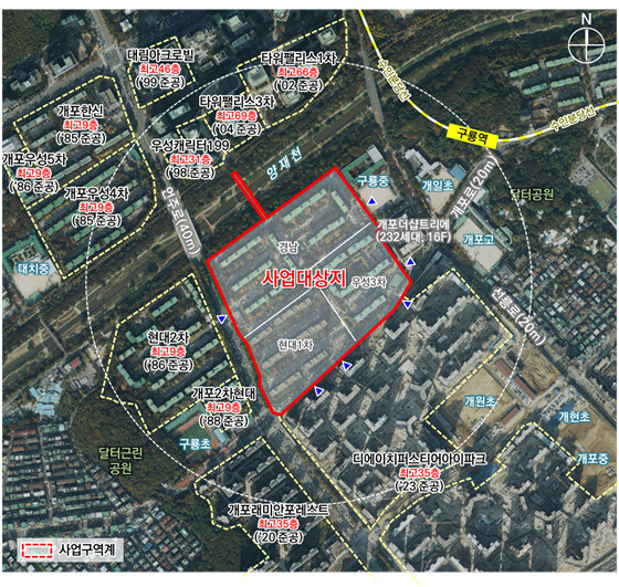 통합개발을 추진 중인 개포경남, 우성3차, 현대1차아파트 중 현대1차아파트가 2017년 가장 먼저 재건축 정비구역으로 지정됐다. 하지만 일체적 기반시설 정비 및 효율적 건축계획 수립을 위해 연접한 우성3차아파트, 경남아파트 주민들과 하나의 단지로 통합 재건축을 추진하게 됐다.