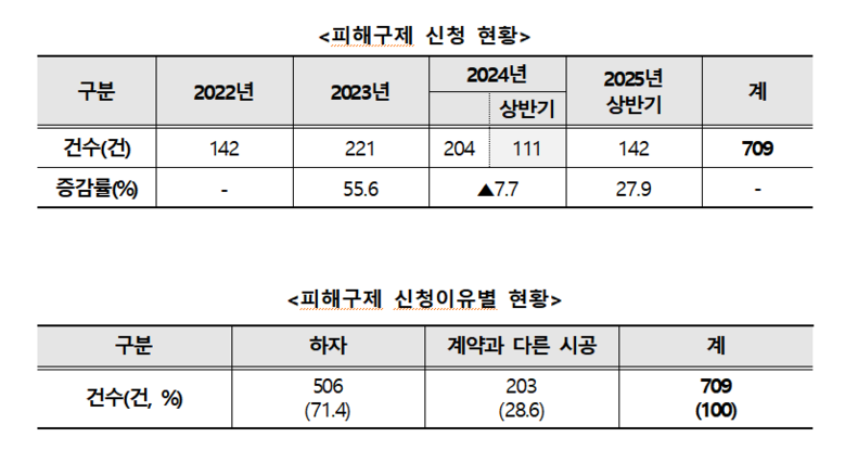 피해 사유를 보면 전체 709건 중 ‘하자’가 71.4%(506건), ‘계약과 다른 시공’이 28.6%(203건)를 차지했다.