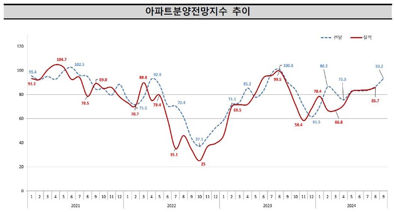 [한국건설경제뉴스=박동혁 기자] 금리 인하 기대감으로 인한 매수 심리 개선으로 이달 전국 아파트 분양 전망이 다섯 달 연속 회복세를 보였다. 미분양 리스크가 큰 지방보다는 수도권을 중심으로 아파트 분양 전망 개선세가 빠른 모습이다.