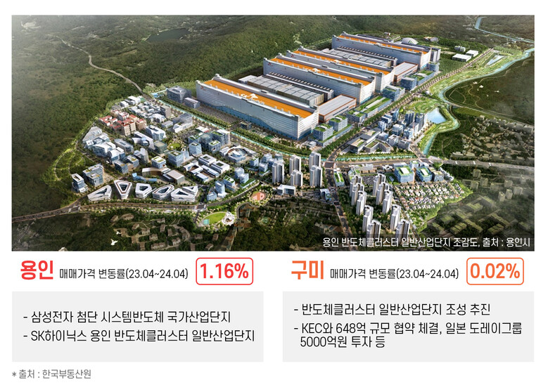 ‘K-반도체’ 산업이 각광받으며 수혜 지역 부동산이 주목받고 있다. 특히 세계 최대 반도체 클러스터 육성을 위해 용인을 비롯해 구미 등을 특화단지로 지정한 이후 이들 지역에서 시세가 오름세고, 신규 분양 아파트에도 관심이 높아지는 분위기다.