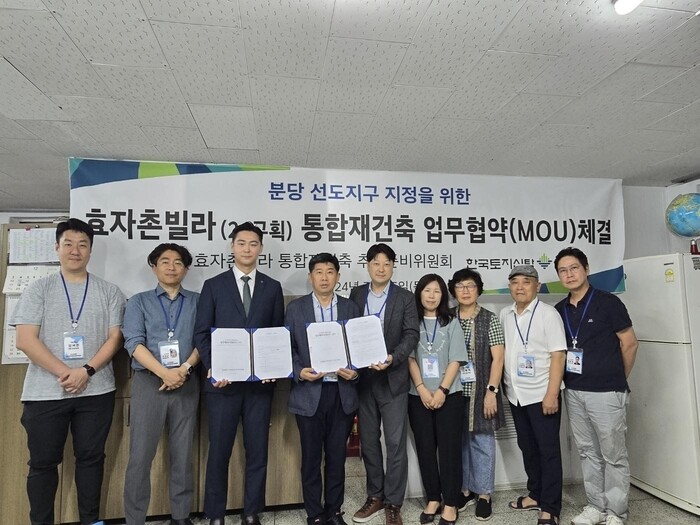 [한국건설경제뉴스=박동혁 기자] 한국토지신탁은 지난달 25일 경기 성남시 분당 효자촌빌라 통합재건축 추진준비위원회와 신탁방식 정비사업 추진을 위한 업무협약(MOU)을 체결했다고 6일 밝혔다.