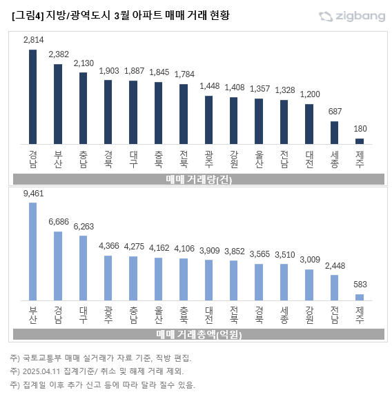 3월 한 달간 거래량은 경남이 2814건으로 가장 많았다. 다음 부산 2382건, 충남 2130건 순이다. 거래총액은 부산 9461억원, 경남 6686억원 대구 6263억원 순으로 많았다.