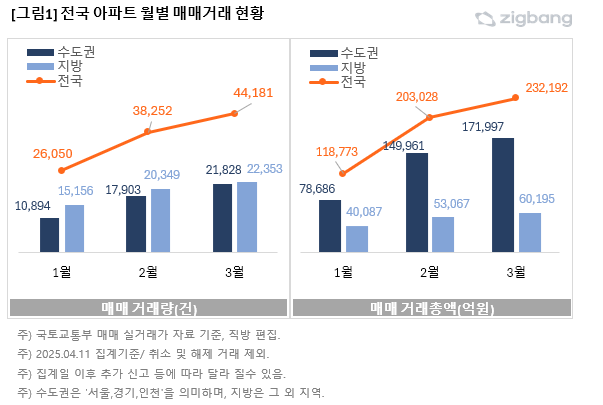 16일 직방이 국토교통부 실거래가 자료를 분석한 결과에 따르면, 전국 아파트 매매거래량은 2025년 1월 2만6050건에서 2월 3만8252건, 3월 4만4181건으로 3개월 연속 증가했고, 거래총액도 1월 11조8773억원에서 2월 20조3028억원, 3월 23조2192억원으로 꾸준히 확대됐다. 1월 대비 거래량은 약 1.7배, 거래총액은 2배 가까이 늘어난 셈이다.