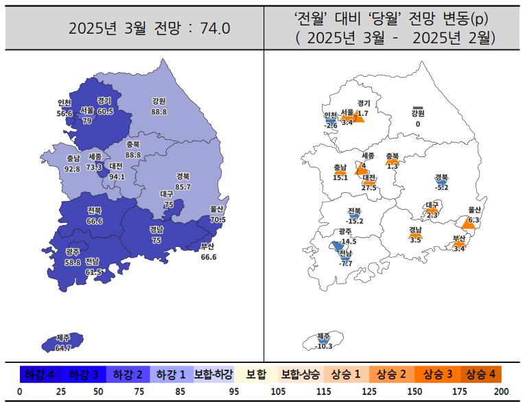 광역시는 4.8p 상승한 73.0으로 전망됐고, 도지역은 2.3p 하락한 78.0으로 전망됐다. 비수도권에서 대전이 27.5p로 가장 큰 상승폭을 보였고, 전북이 15.2p로 가장 큰 하락폭을 보였다.