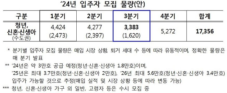 모집 규모는 청년 1812가구, 신혼·신생아 1571가구 등 총 3383가구로 이르면 올해 12월 초부터 입주할 수 있다.
