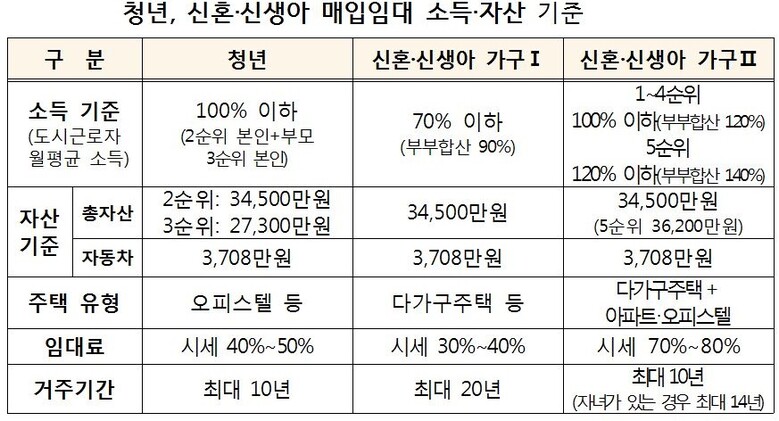| ▲청년, 신혼 신생아 매입임대주텍 소득 및 자산 기준 / 제공=국토부 |