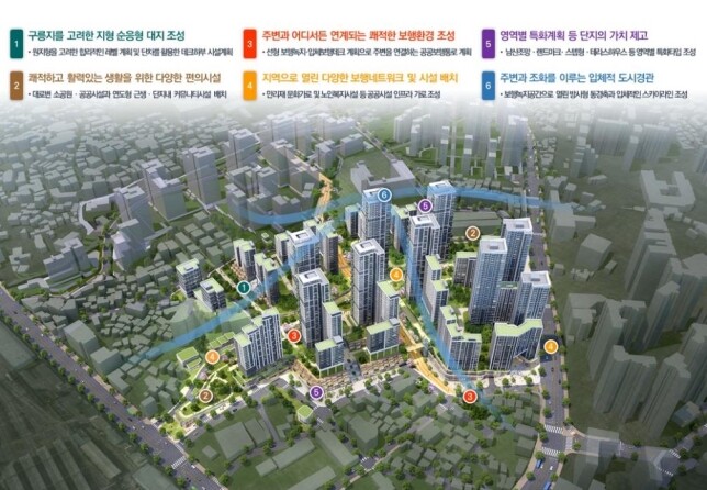 입체적 스카이라인 형성과 통경축 확보 등 도시경관도 고려했다. 단지 중앙은 통경축을 따라 고층, 단지 내 최고점이자 학교연접 남측부는 중저층 등 영역별 높이 계획을 적용했다. 더불어 단지 내 동서, 남북 공공보행통로와 연계한 방사형 통경축 등으로 남산 조망이 가능한 다채로운 도시경관도 창출한다.