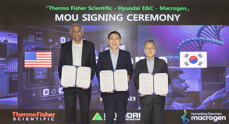 이날 협약식은 현대건설 윤영준 사장, 써모 피셔社 산타뉴 코시카(Shantanu Kaushikkar) 글로벌 유전과학사업부 부사장, 마크로젠 서정선 회장 등 각 사의 주요 경영진이 참석한 가운데 진행됐다.
