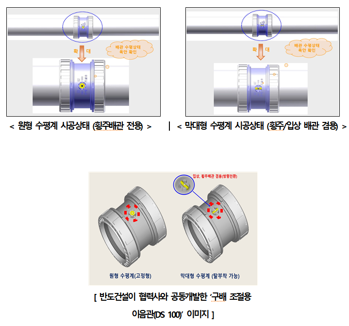 ‘구배 조절용 이음관(DS 100)’은 각종 배관 시공에 사용하는 이음관에 원형과 막대형 수평계가 장착돼 있어 수평 및 수직의 구배를 육안으로 확인할 수 있도록 함으로써 시공의 정확성을 높일 수 있도록 한 제품이다.