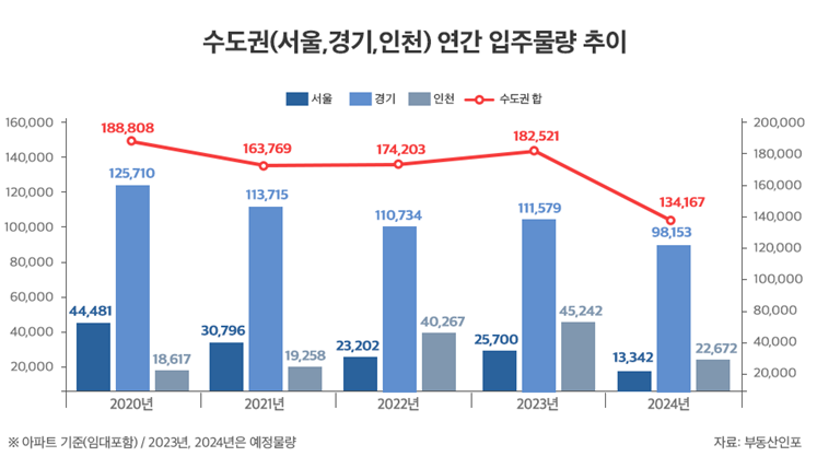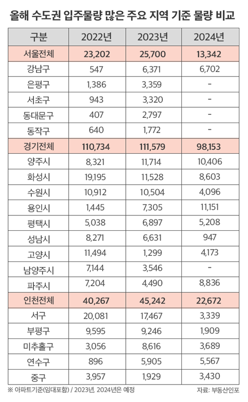 지역별로 보면 △서울 2만5700가구 △경기 11만1,579가구) △인천 4만5,242가구 등이다. 인천이 지난해에 이어 올해까지 4만가구 이상 입주가 몰려있다.