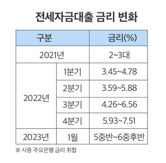 지난해 1.25%로 출발했던 기준금리는 11월엔 3.25%를 기록했다. 전세자금대출도 작년 1분기경 3.45~4.78% 수준에서 4분기에는 5.93~7.51%까지 치솟았다(출처: 시중 주요은행 금리). 현재는 소폭 낮아진 상황이다.