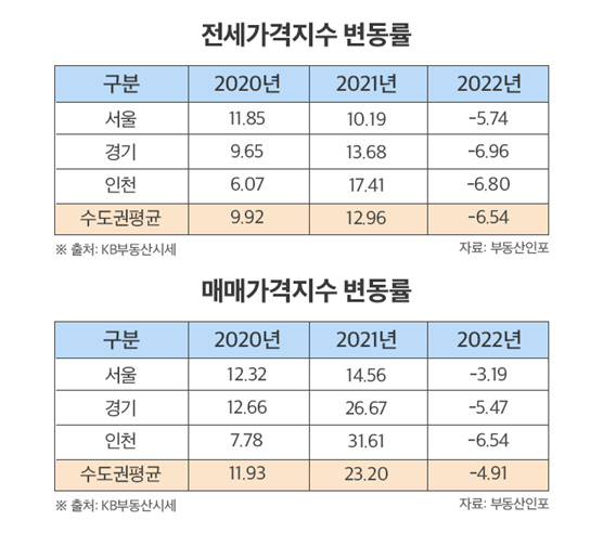 KB부동산 월간시계열 전세가격 지수 변동률을 살펴보면 수도권 지난해 전세가격지수 변동률은 6.54% 하락한 것으로 나타났다. 매매가격지수가 4.91% 하락한 것과 비교하면 꽤 높은 수준이다. 지역 가운데는 경기가 6.96%로 가장 전세하락폭이 컸다.