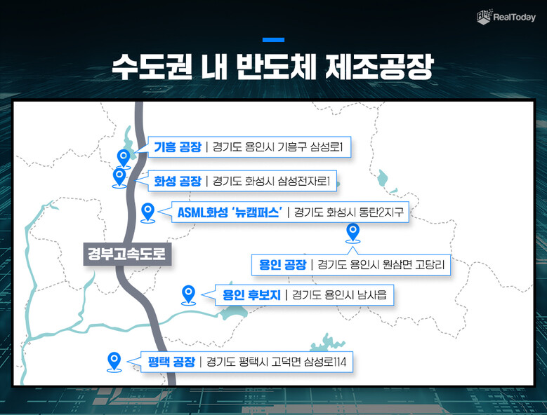 특히 삼성전자는 기흥, 화성, 평택에 반도체 생산기지를 갖추고 있어, 이번 용인 반도체 클러스터가 경부선 라인이 ‘반도체 중심축’으로 도약하는 전환점이 될 것으로 분석된다. 실제 삼성전자는 기흥캠퍼스(파운드리·LED), 화성캠퍼스(D램·낸드플래시·파운드리), 평택캠퍼스(D램·낸드플래시·파운드리)에서 반도체 생산시설을 확보하고 있다.
